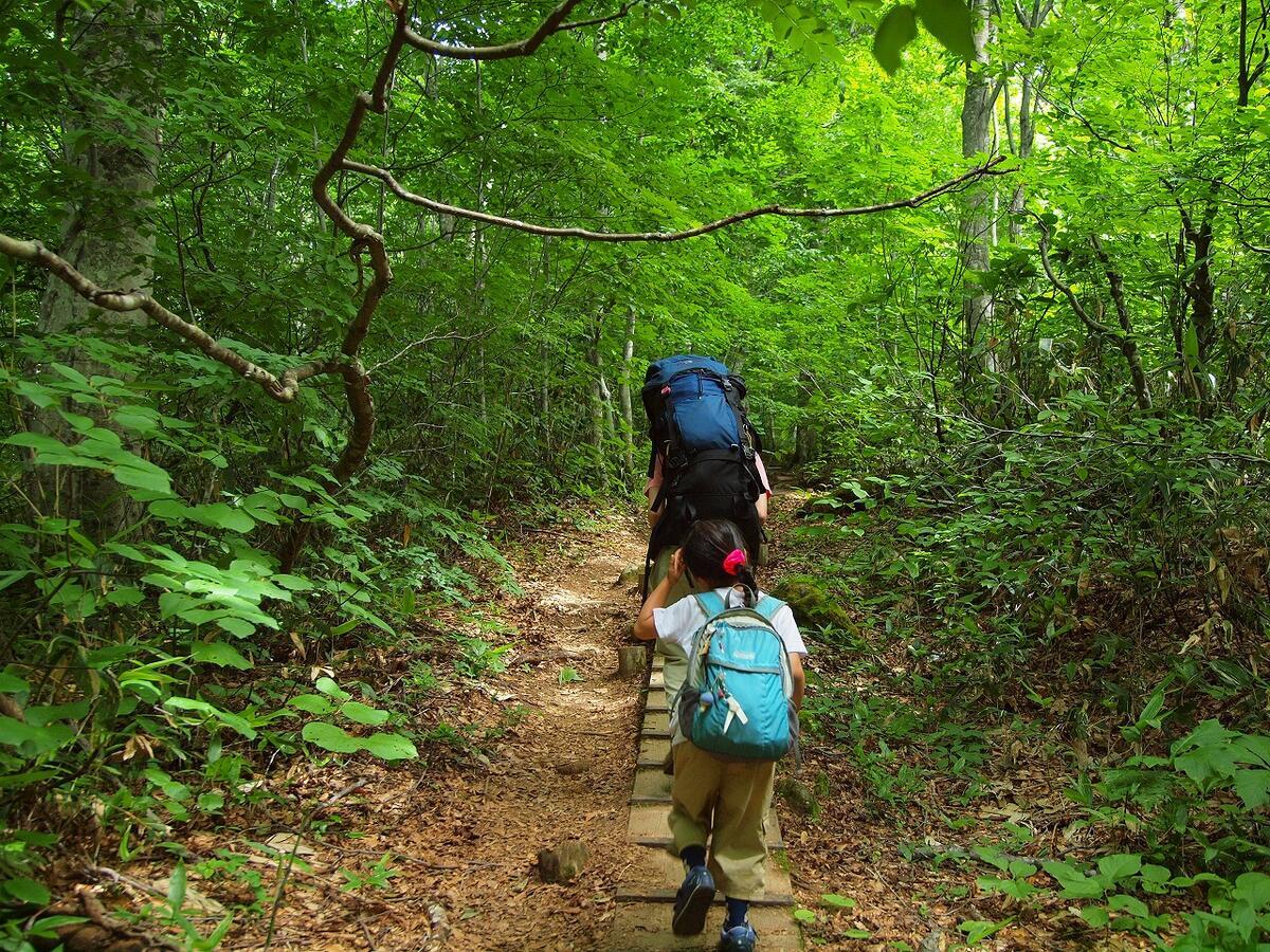 峠の茶屋駐車場からは、標準コースタイム約2時間で三斗小屋温泉まで登山道を歩いてアクセスします。