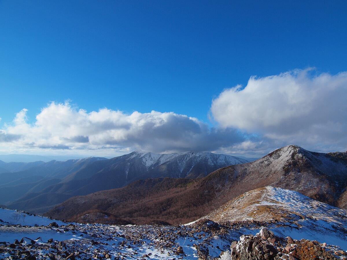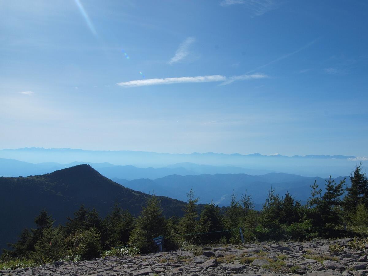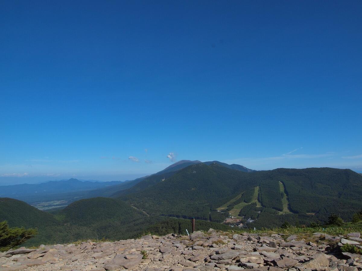 山頂からは福島方面の山々も見ることができました。どれがどれかはよく分からないですが、安達太良山や磐梯山が見えていたのでしょう。