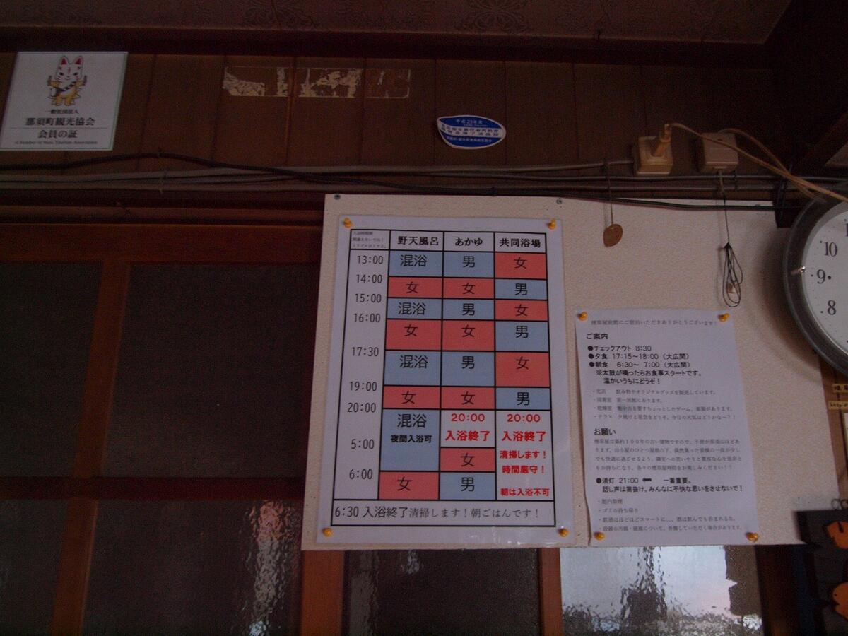 テント泊は料金に温泉入浴料が含まれており、野天風呂のみ利用が可能で、下の時間割となっていました。男性は混浴に入ることになります。
