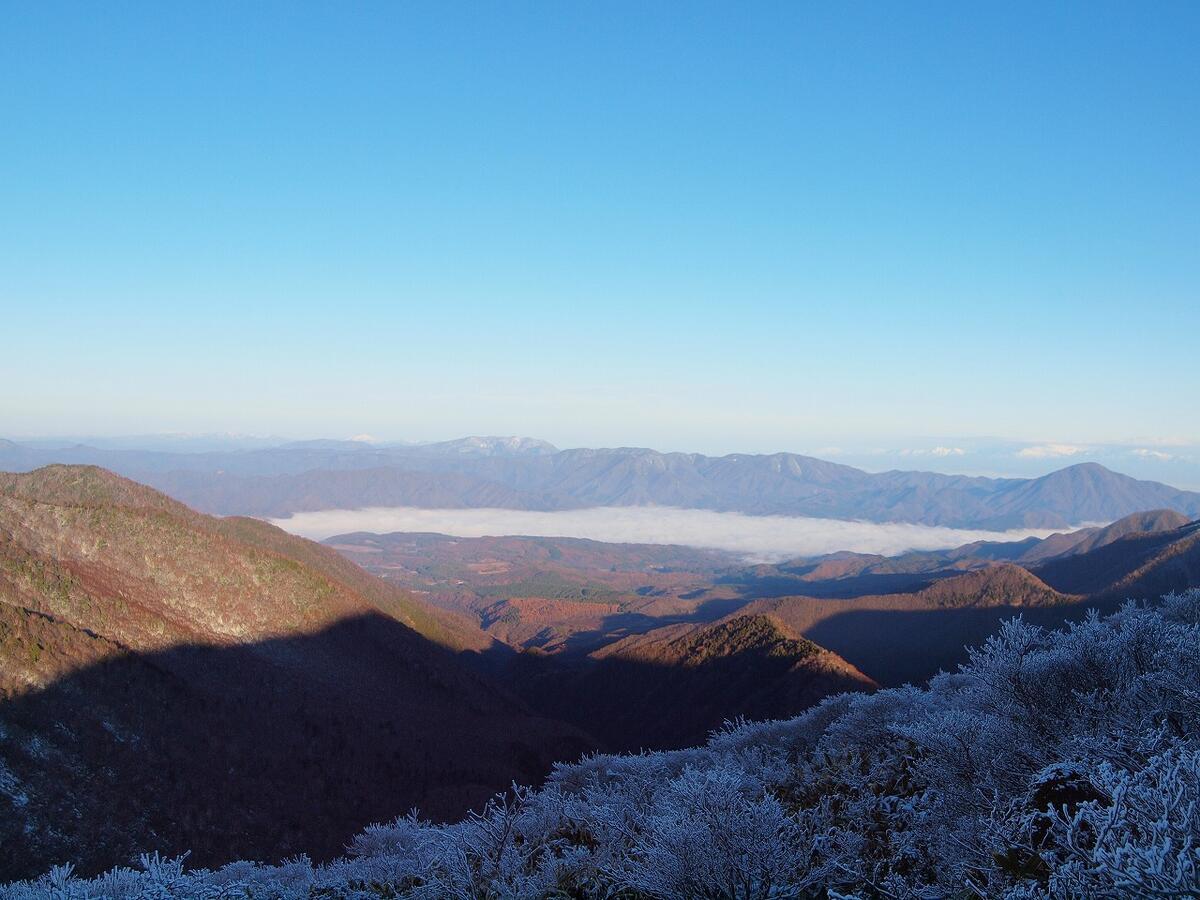テントサイトからの眺めですが、あまり眺望は期待できず、下の写真のように、木々の間から向かいの山々が見えるくらいでした。見えたのは、恐らく三倉山~高倉山の稜線だと思います。