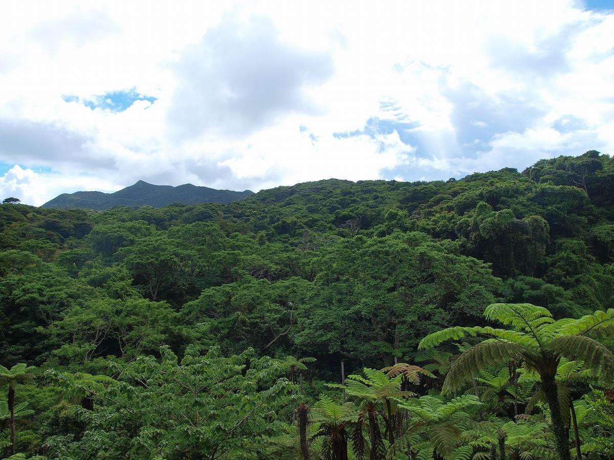 DINO恐竜パークの園内は、まさに恐竜がいそうなジャングルの雰囲気です。下の写真は、入園してすぐのところから撮った写真ですが、鬱蒼とした森にヤシの木が生え、なんとも雰囲気があります。沖縄だからこそこんな雰囲気を出せるのでしょう。