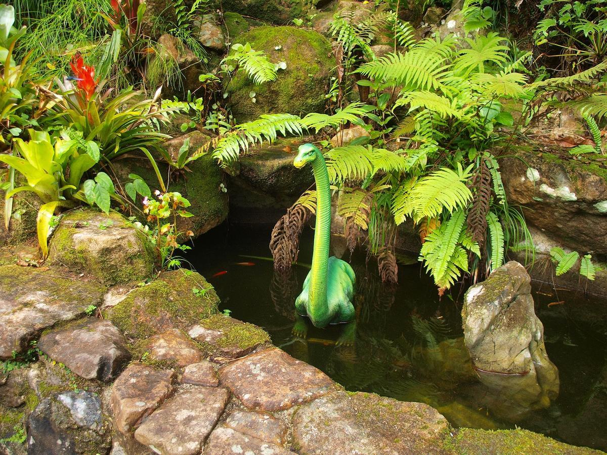 出ました!恐竜です(下の写真)。周囲の景色に溶け込み、作りが非常にリアルです。恐竜は全部で80体以上あるとのことですが、どれも精巧に作られています。