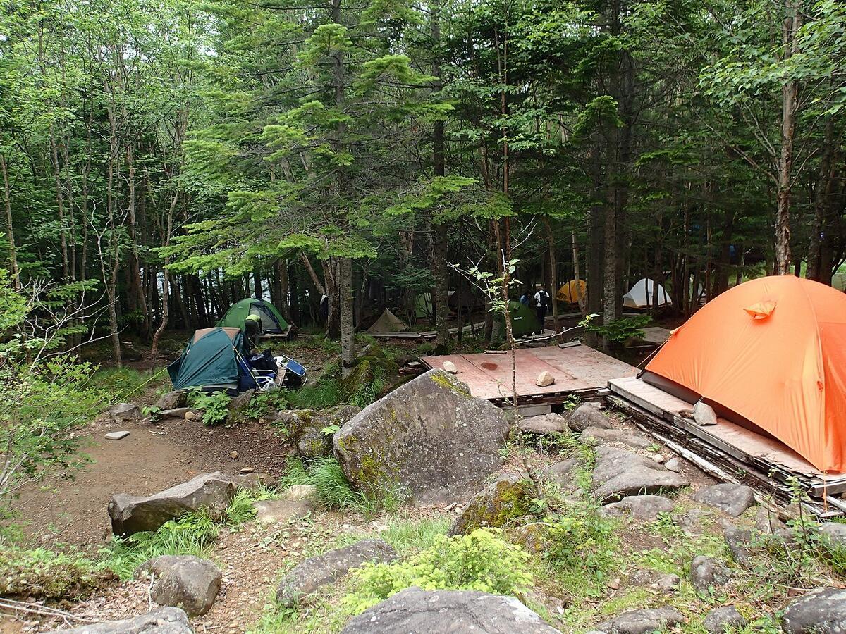 ここはバス停や駐車場がある上日川峠からテント場まで、わずか25分の歩きで到着でき、抜群のアクセスの良さです。しかもテント料金が安く、今時1人500円で宿泊できます。コロナ禍以降どこのテント場も料金が大きく値上げされており、500円は珍しいです。まあいずれ1,000円とかへ値上げされるのでしょうけど。。