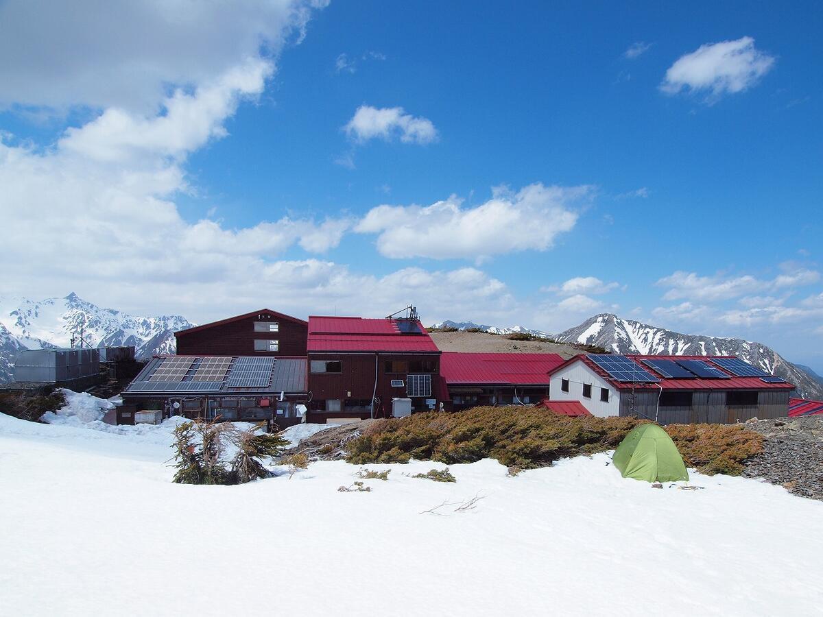 下の写真は高谷池ヒュッテとテント場です。テント場はこぢんまりとしていますが、あらかじめ予約しておいたので、隣との間隔は狭いながら、張ることができました。