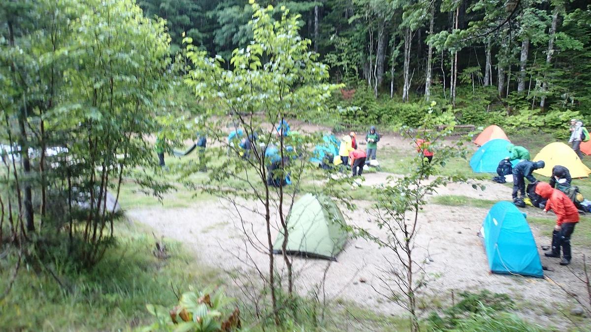 下の写真は明け方5時くらいのテン場の様子です。かっぱを着て撤収作業となりました。ただ、この後は一時的ですが雨が止み、晴れ間も見えていました。