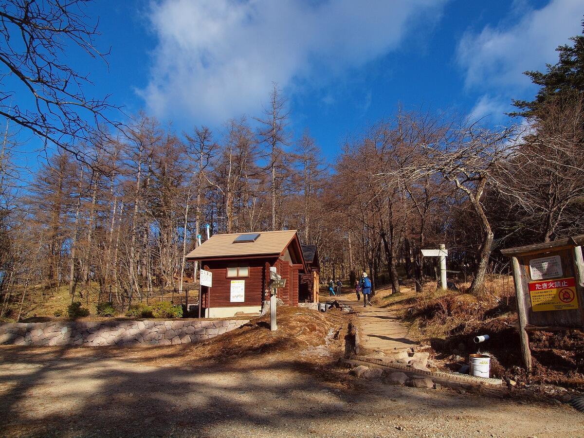 下の写真が笠取小屋ですが、冬季なのにまだ営業していました。正月まで営業するそうです。この日は天気が良く、笠取山へ向かう登山者が続々と登ってきていました。