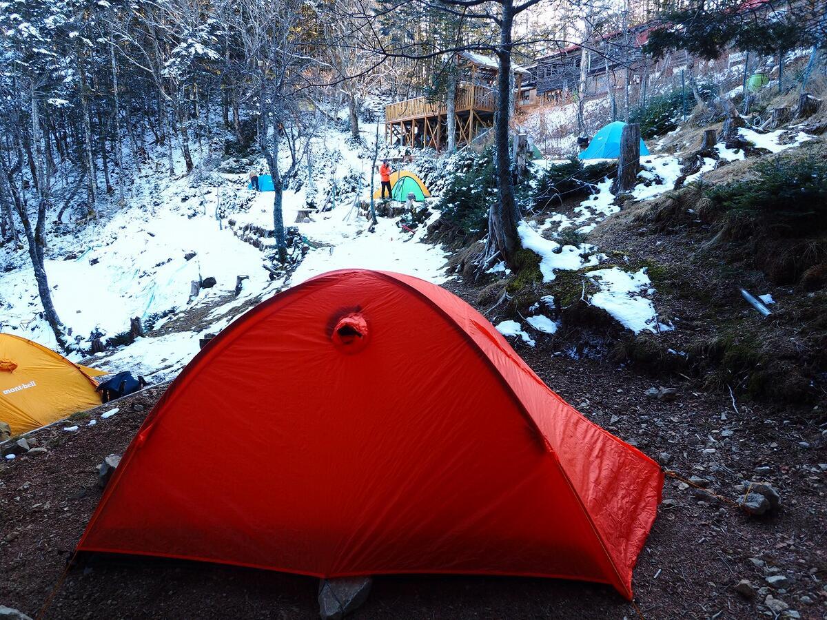 テント場は山荘横にあり、細長く広がっていました。スペース的にそこまで広くなく、雪が積もった日はどこまでがテント場なのかよくわからず、張数は最大30張とのことですが、雪の時期はせいぜい10張程度かなと思いました。実際テント泊している人は少なかったので、問題なかったです。