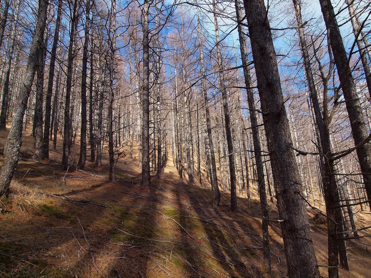下の写真は、縦走路から少し外れた、登山者が少ない和名倉山の山頂付近です。カラマツがびっしりと高密度に林立する様子は絵になります。