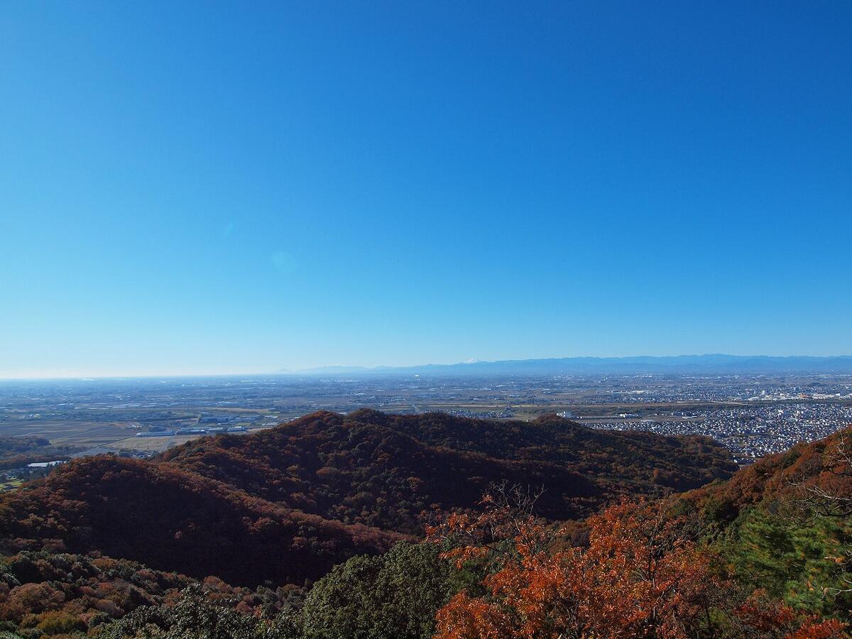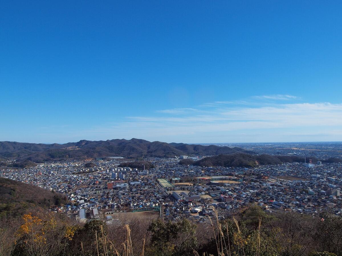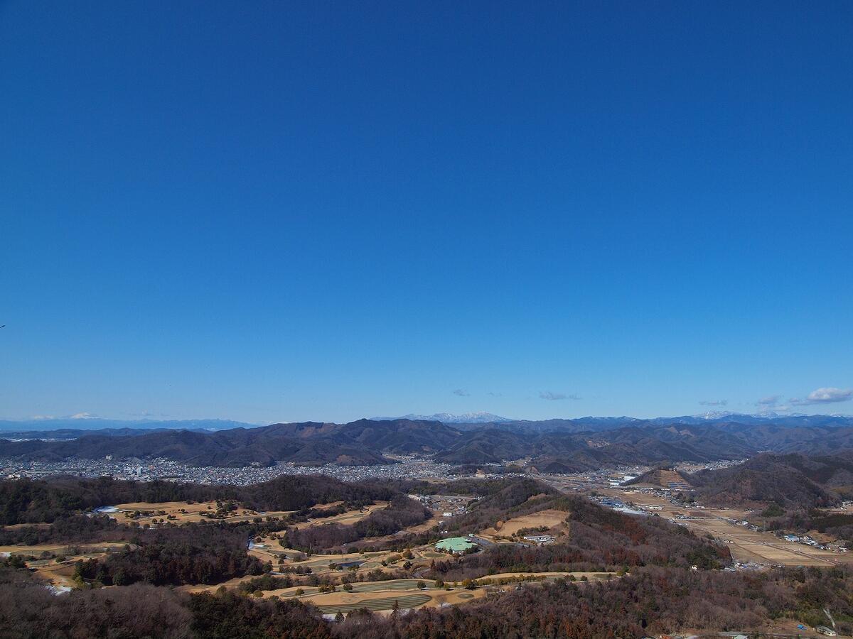 下の写真は大小山山頂からの眺めです。足利市街とその向こうに秩父や八ヶ岳などの山が見えます。
